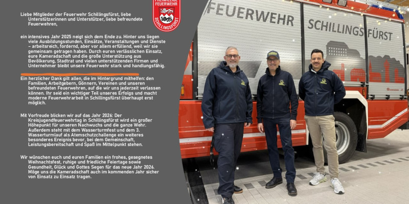 ein intensives Jahr 2025 neigt sich dem Ende zu. Hinter uns liegen viele Ausbildungsstunden, Einsätze, Veranstaltungen und Dienste – arbeitsreich, fordernd, aber vor allem erfüllend, weil wir sie gemeinsam getragen haben. Durch euren verlässlichen Einsatz, eure Kameradschaft und die große Unterstützung aus Bevölkerung, Stadtrat und vielen unterstützenden Firmen und Unternehmer bleibt unsere Feuerwehr stark und handlungsfähig.